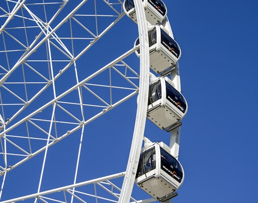 A los niños les encanta el suave paseo de la noria y las vistas de la ciudad. Cada góndola está cerrada por seguridad.