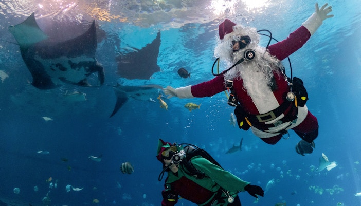 Step into a festive underwater wonderland filled with twinkling lights, a towering holiday tree, cheerful music, and joyful energy that makes every visit feel like a special holiday tradition.